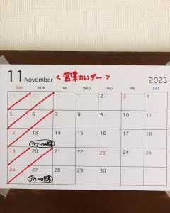 カレンダーにある通り11月より第一第三月曜日を除く月曜日のディナータイムを営業いたします。